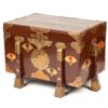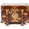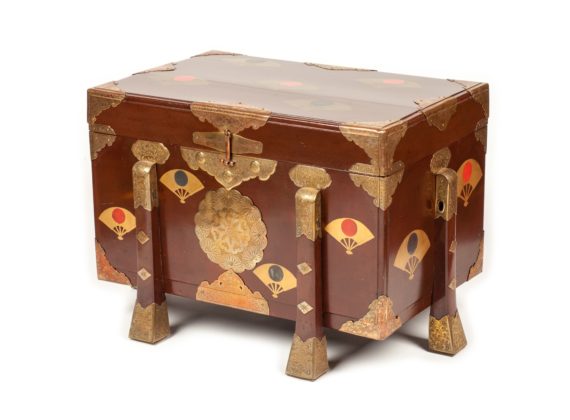 Late Edo period karabitsu or storage chest. The hiramakie lacquer decorated with gilt gunsen, or samurai war fans, with whole chest supported by gilt metal and copper mounted legs.