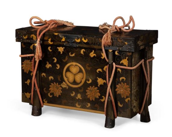 Japanese lacquer and gilt karabitsu of large size. The central pawlonia flower mon surrounded by kiku and foliar motifs, all supported by six legs with brass fittings.