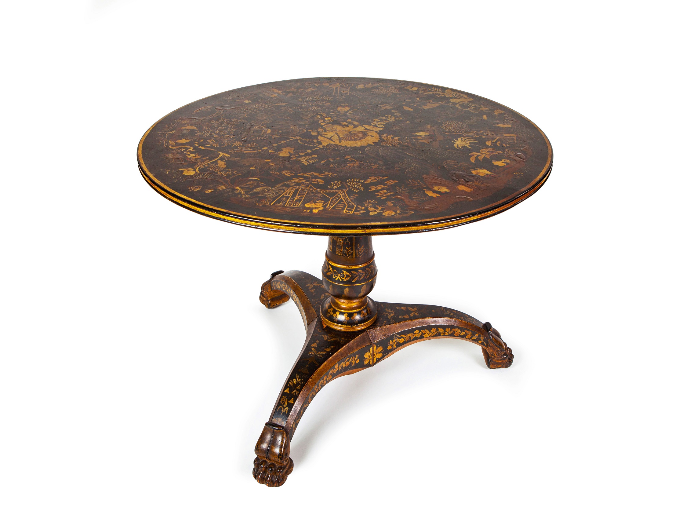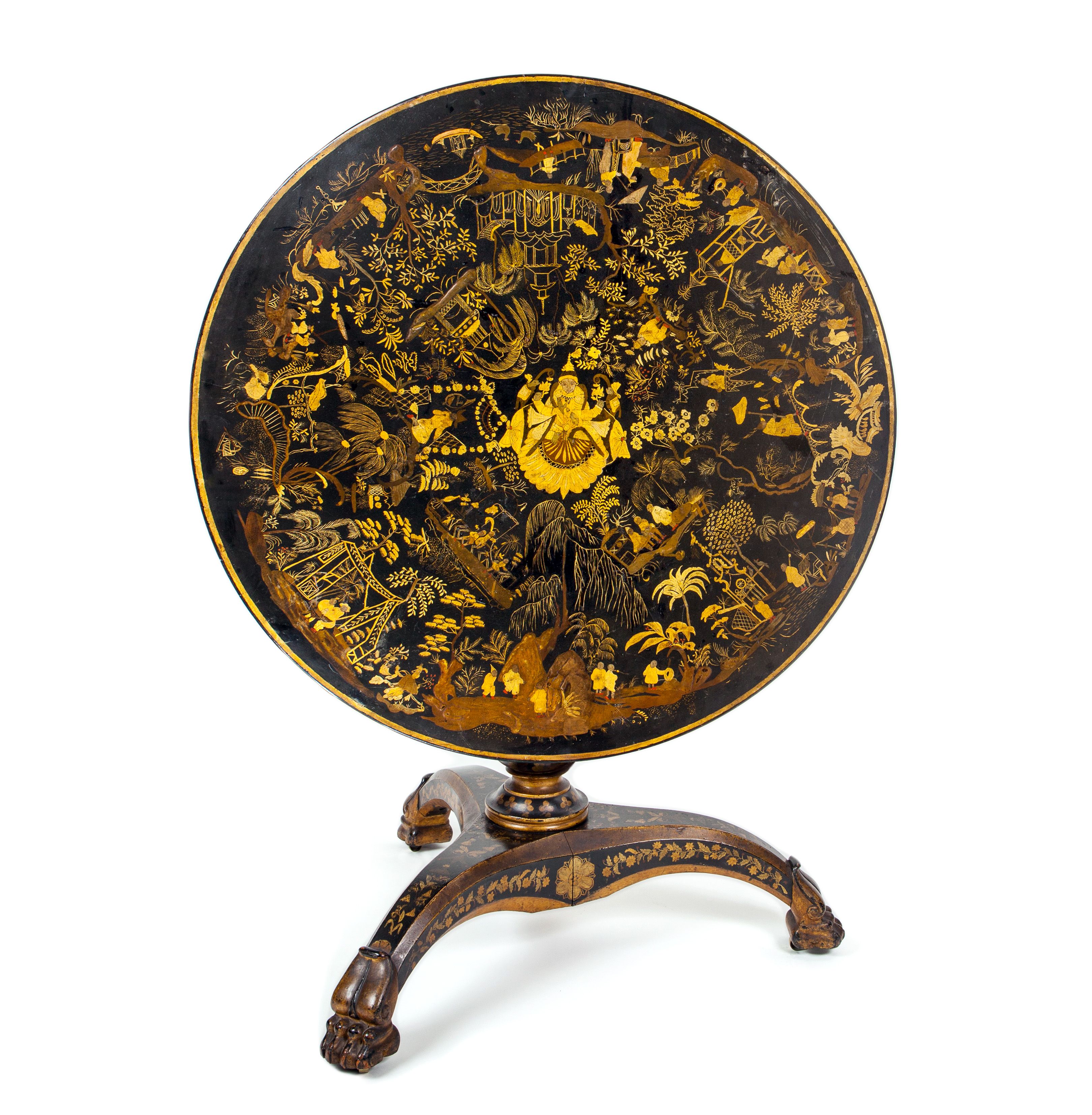 Chinese export lacquer and gilt tilt top table. The circular top with Chinese motifs, supported by a gilt decorated central pedestal and outswept legs, all with gilt decoration, and terminating in gilt lion paw feet.