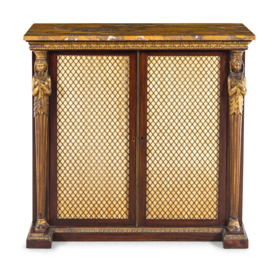 A Regency period rosewood and gilt side cabinet. The cabinet with two gilt terms either side of gilt brass grillwork, beneath a siena marble slab, all supported by a rosewood and gilt-enahnced plinth base. The gilt terms clearly relate to the work of Thomas Hope, inspired by Egyptian antiquity.