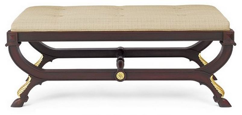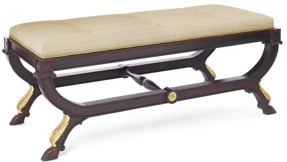 The seat rail is supported on two curule legs formed by S-shaped members joined in the center by a turned wooden spindle terminating at either end in a stylized gilt metal rosette. The legs are carved above the feet with prominent hand gilded acanthus leaves, crowned by an Ionic capital, and rest on hoof feet with carved ‘C’ scrolls behind.