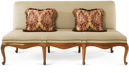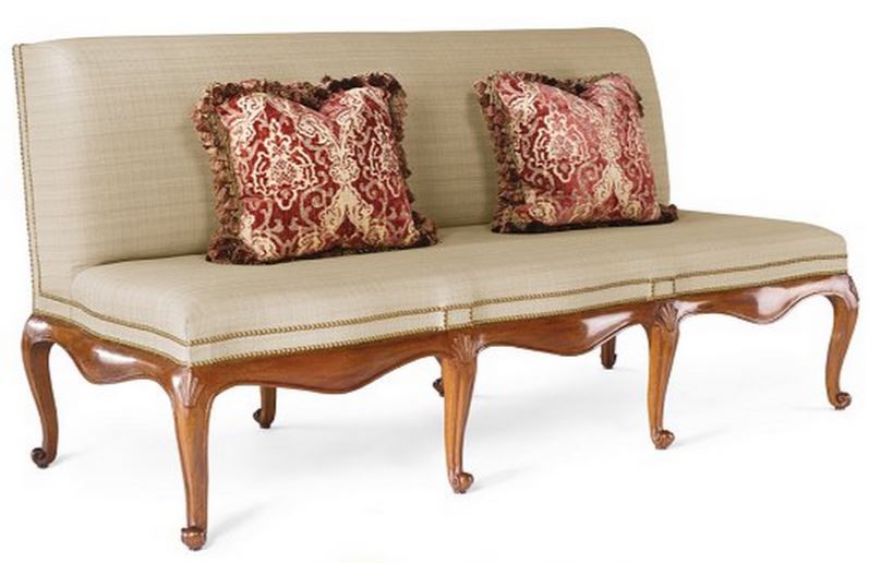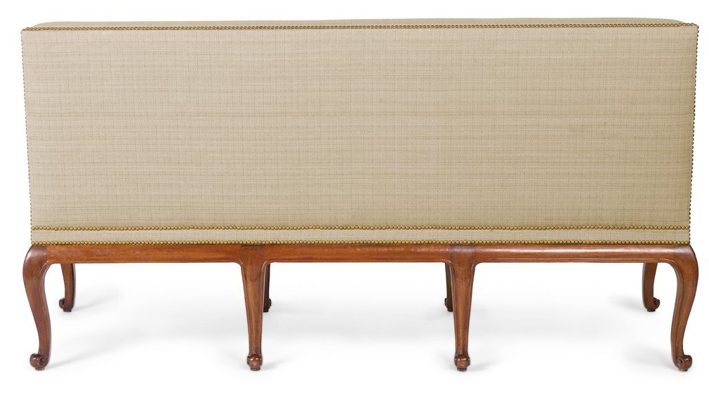 The undulating serpentine show frame base with a ‘cushion’ frieze and cabriole legs with a carved scallop motif at the knee and terminating in French scrolled feet. As shown, the base is constructed from sustainably harvested mahogany. The under frame is constructed of farm-raised poplar.