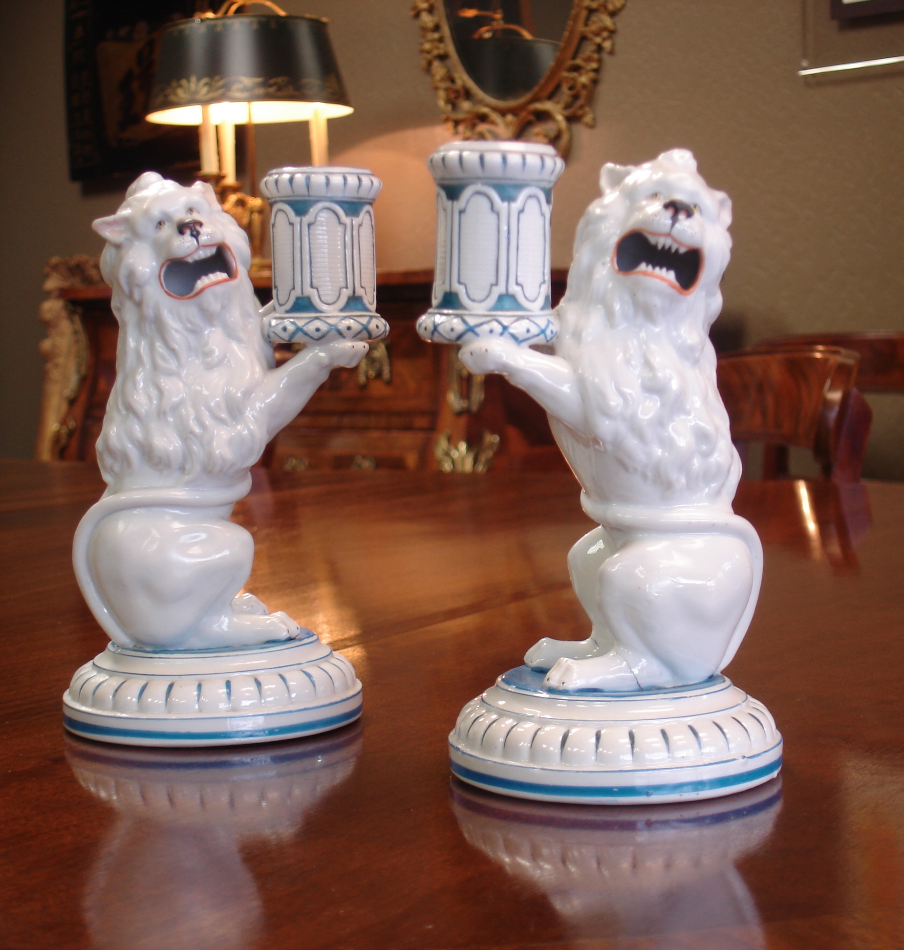 A pair of lion form candlesticks. The opposing pair of white glazed lions rampant, each holding a cylindrical holder, and all supported by a gadrooned trimmed plinth, picked out in Prussian blue.