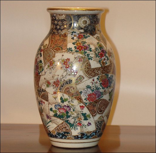 A Kyoto Satsuma ovoid vase painted and gilt with fan shaped panels of flowers, including irises, chrysanthemums, peonies, prunus, and magnolia, signed Kinkozan.